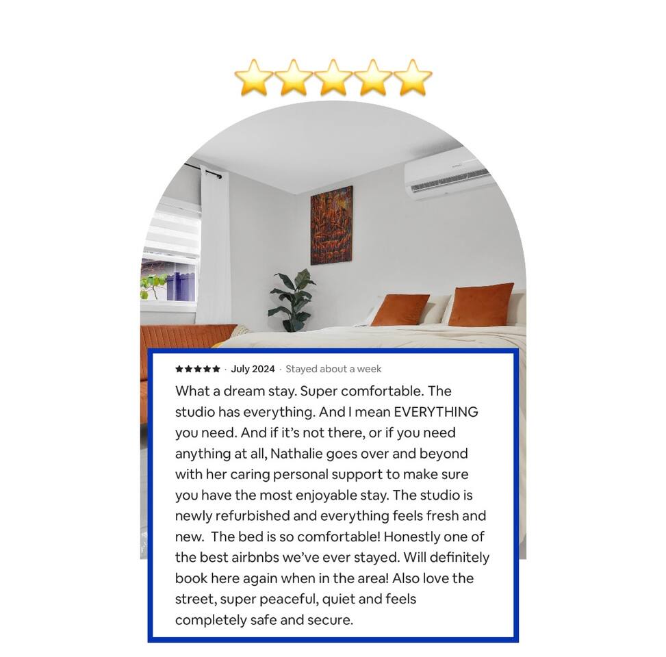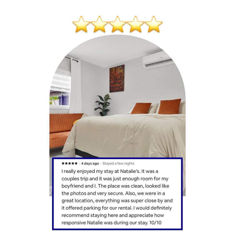 Experience top comfort in this private oasis. Suite Azul is a serene one-bedroom guest suite nestled in a quiet Miami neighborhood. Located just a short drive from the city’s vibrant nightlife, diverse culinary scene, iconic landmarks, and hidden local gems, it’s the perfect home base for exploring all that Miami has to offer. Enjoy special savings on stays of five nights or more.
