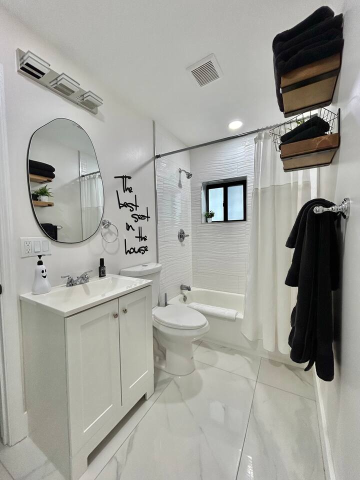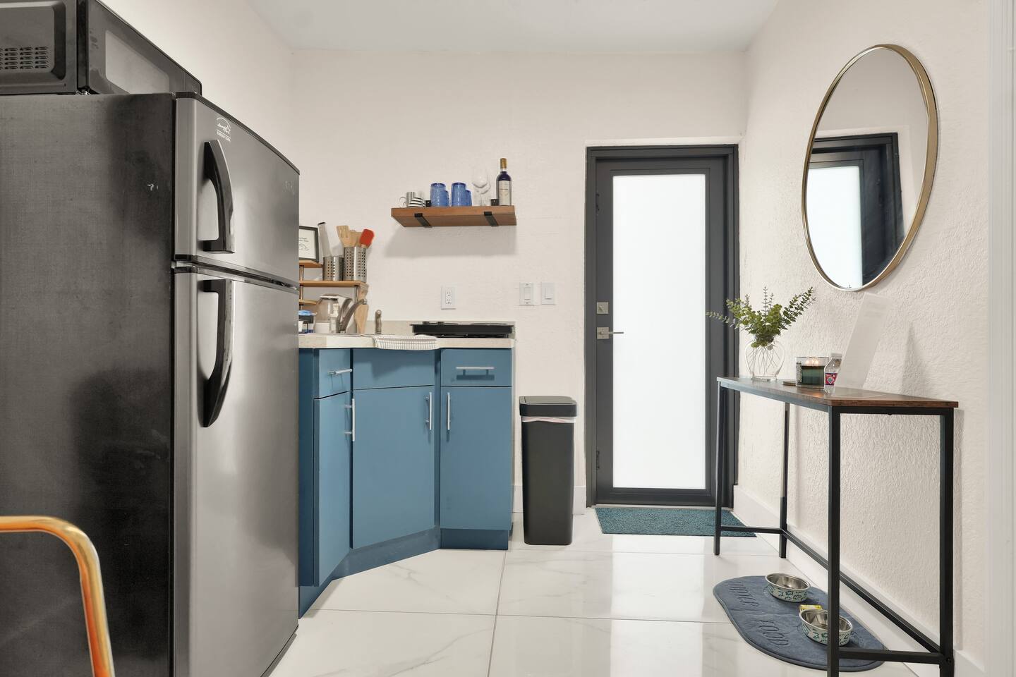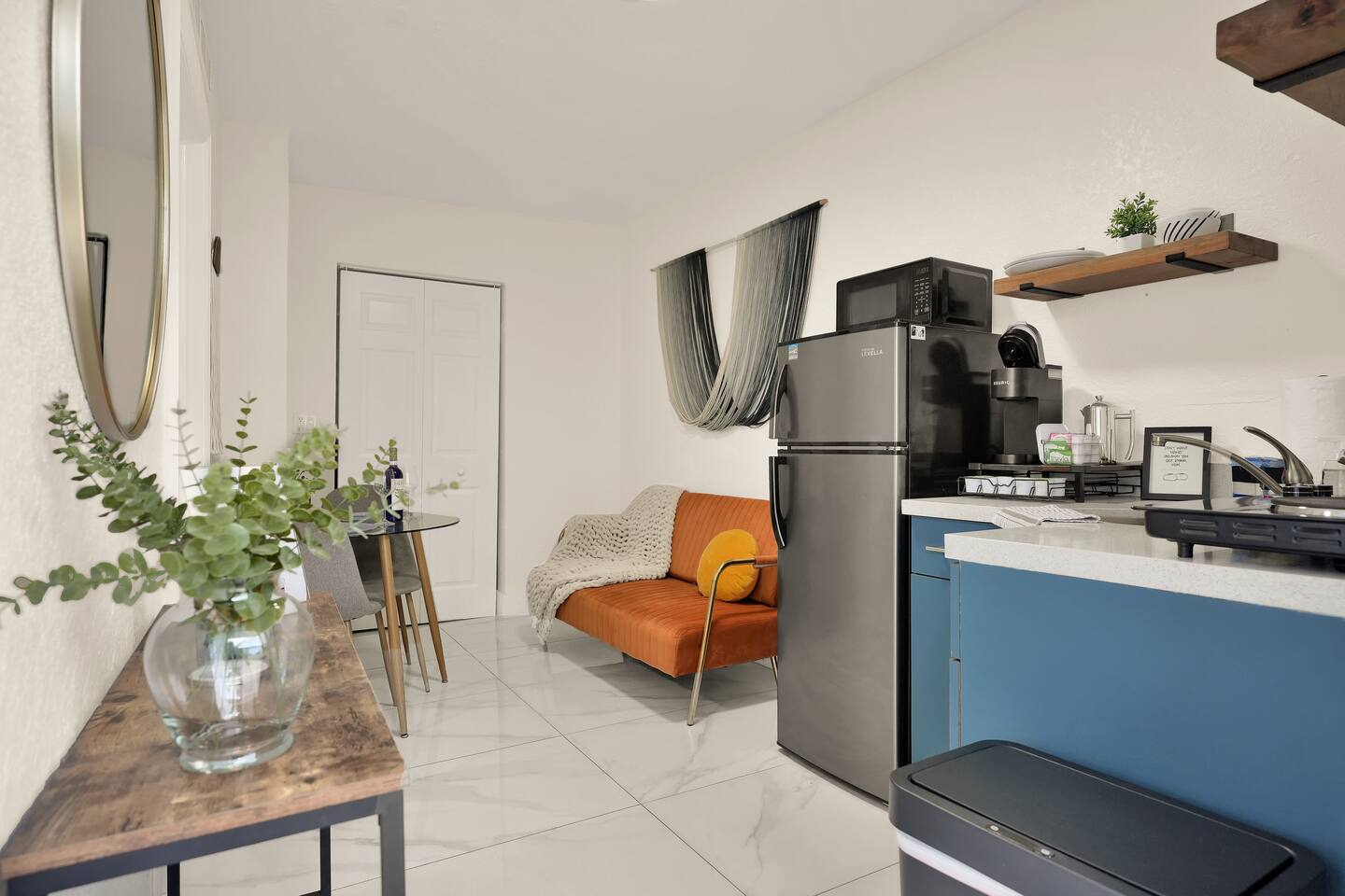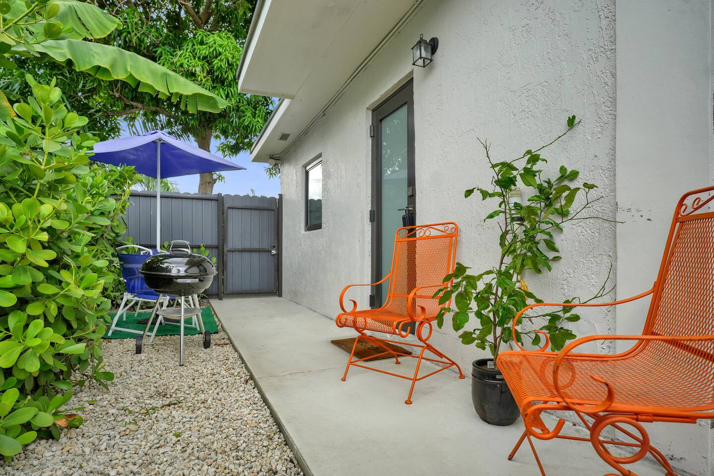Restful and private guest suite with a separate kitchenette, a cozy dining and living area, and a fully fenced-in patio. A free designated parking spot is also included for your convenience. The space is thoughtfully stocked with everything you need for a comfortable and enjoyable stay. Perfect for solo travelers, couples, close friends, food lovers, and adventurers. The suite accommodates up to two guests. Well-behaved and trained pets are welcome, because we know they're part of the experience too. SHORT DRIVES (w/o traffic) ★ 3 mins.* away from neighborhood food hall and roof top, The Citadel ★ 10 mins.* away from Miami Design District or Wynwood ★ 15 mins.* away from North Beach, downtown, or the hospital district ★ 15-25 mins.* away from South Beach, Brickell, Miami International Airport or Hard Rock Stadium DESIGN Intentionally designed with a color palette to evoke a harmonious blend of warmth & tranquility. WHERE YOU’LL SLEEP Queen-sized bed with cloud-like features, soft linen and cozy fleece blankets for extra comfort. Ultra soft foam earplugs and a sunrise alarm clock with wake-up light, 7 nature sounds and 8 color night lights are available bedside. AMENITIES We provide kitchen essentials along with beverages and toiletries as complimentary starters. PRIVATE YARD Private yard oasis with personal charcoal grill, table and chairs. ENTRY Lock box with code provided the morning of your arrival day for a seamless check-in. FREE PARKING One (1) free designated parking spot in front of the residence premises. BEACH ESSENTIALS (1) beach bag, (2) beach towels, (1) umbrella, (1) chair), (1) mini handy cooler MID-TERM STAYS 28+ days are welcomed. A weekly change of freshly laundered linen and towels is provided and bi-weekly cleaning is offered at no extra charge. A lease agreement is required. CHILDREN 0-2 A travel crib/play yard, toddler books, toys, BabyBjorn bouncer and dinnerware are all available upon request. Your stay at Suite Azul is designed to be enjoyable, and effortlessly comfortable, leaving you to focus on exploring the vibrant Miami neighborhoods, working just minutes away or enjoying laidback remote work.
